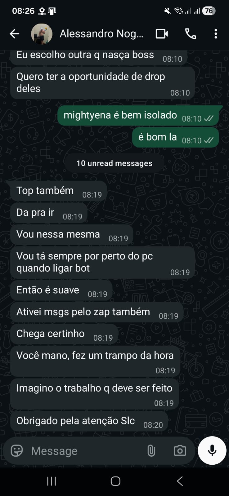 Ativei msgs pelo zap também. Chega certinho. Você mano, fez um trampo da hora. Imagino o trabalho q deve ser feito. Obrigado pela atenção Slc